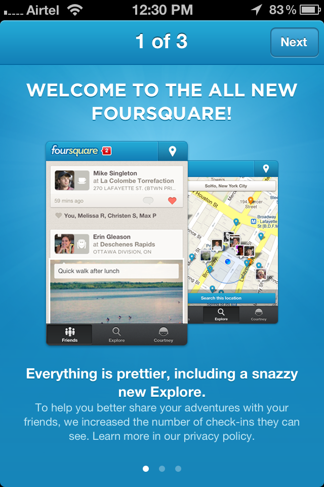 Few days back Foursquare announced that new update will be released soon with UI changed and new features. As promised Foursquare updated its iOS app. Now you got new UI and it’s pretty impressive.